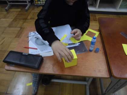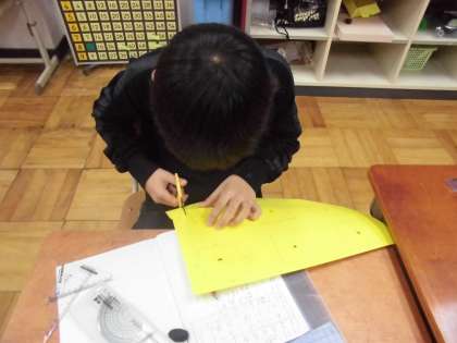 面の形と数を調べたあとは,切り取って箱に貼りました。立方体の他にも直方体や,大小異なる箱についても調べ,箱作りに取り組もうと思います。