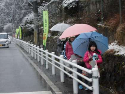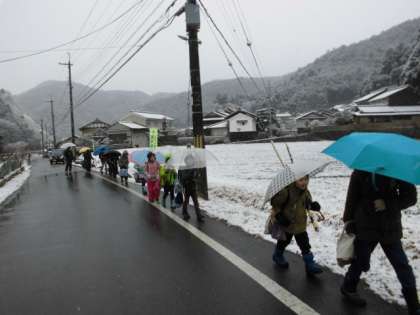 あちらからも、こちらからも、1列で登校します。人とあわせて歩きます。