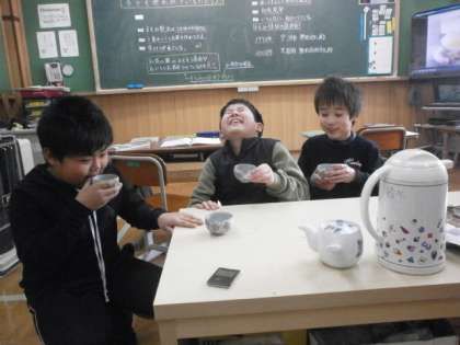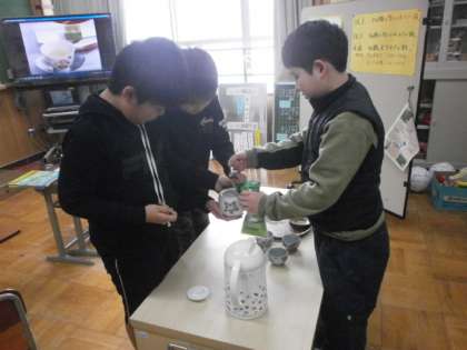 今日の5時間目の社会の時間に,「産業のさかんな宇治市」の学習で,宇治市が作っている玉露を飲む体験をしました。ビデオでおいしい玉露の淹れかたを確認した後に,実際に自分たちで淹れて飲んでみました。ずっと学習をしていながら「玉露ってどんな味なんだろう?」という思いを持っていたこともあり,その美味しさを味わいながら飲んでいました。「これは無形文化財になるのも分かります」「作った人の心がこめられています」等,体験の後には言っていました。より宇治市の事を身近に感じることができました。