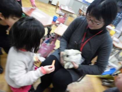 うさぎの目から白い目やにが出ていることに気づき、知らせにきました。そして、受診して、目薬を差すことになり、目薬が差しやすいところに置いておきたいので、だれでも目に付く廊下にしばらく置いて看病することになりました。進んで世話や目薬さしの手伝いにやってきます。ウサギの様子の変化に気づいて知らせることや状況に気づき手伝いに来るなどしています。このことも2月の人権目標にしていることと同じです。仲良くしていこうとすることや相手のことを知ることです。
