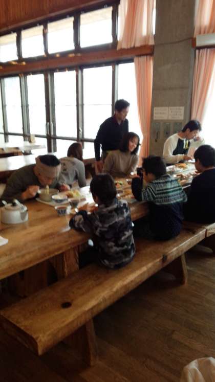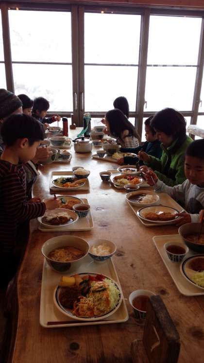 雪の中でしっかり運動して、おなかがぺこぺこ。食堂でおいしい昼食をいただきました。カレーやラーメン、メンチカツや春巻き、サラダなど、遊びとともに、食事時間もとっても楽しく過ごすことができました。