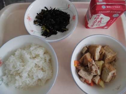麦ごはん 牛乳 豚肉と野菜の煮つけ 小松菜とひじきのいためもの
