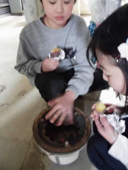お餅は、とてもおいしいとの感想が多かったです。電子レンジやトースターだとすぐに焼けるけど、炭で焼いた方がおいしいとのことです。苦労の味もしたのかもしれません。炭火が残っているので、サツマイモを洗って、アルミホイルに包んでおいておくとおいしい焼き芋ができました。炭火の長持ちするよさも実感していました。炎は出ないけれど、長時間火が保てることや七輪の保温力にもふれることができました。3時間ぐらい火がついていたことにびっくりしていました。
