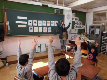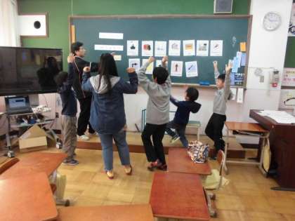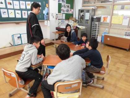 道案内をします。校舎の中の図書室や校長室、体育館などへ行きたいという方を右へ曲がるとか階段を下りるなどの言葉を言いながら案内します。そのために部屋の名前を楽しく何度も言うゲームをしたり、相手に尋ねることとどこへ行きたいかの回答の受け答えを伝言ゲームをしたりして実際に案内に向けての準備を楽しくしました。意欲的に声に出していきました。少々まちがっていてもいいので、聞こえたように声に出すことを心がけました。