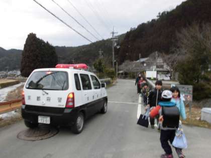 休み明けです。見守りもあり、元気に出発。パトカーもパトロールしています。
