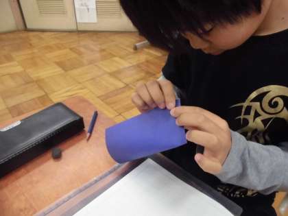 色紙を使って,半分の大きさをつくる学習をしました。正方形の紙を縦半分に折り,そのあとは,はさみで切りました。また,他にも半分の大きさがつくれないかを考え,三角形をつくる折り方を見付けました。折り方をかえることで,同じ半分の大きさでも違った形をつくることができました。