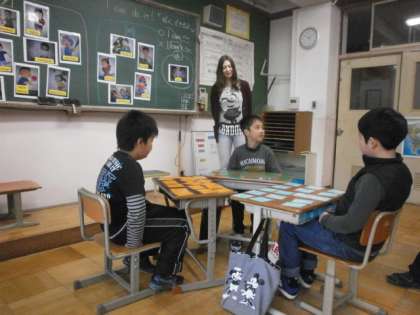 今日の2時間目に,FSのキンガさんに来ていただき,英語学習を行いました。最初に,いろいろなスポーツについての表現をふりかえり,「I can play〜」のやりとりについて確認し,キンガさんと一緒に繰り返し発音しました。その後に,カードを使って,できるスポーツ。できないスポーツごとに分けたり,ゲームをしたりしながら楽しく学習することができました。