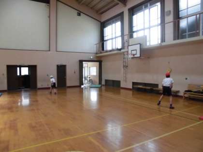ベースは、マットです。ホームからファースト、サードを回ってホームに帰ります。ピッチャーの投げるボールを打つとゲームが進まないので、自分でトスをしたり、置いたりして打ちます。初めは打った後にベースを速く回ることや守る方は、ベースにボールを運ぶことになれるように扱いの慣れているソフトバレーボールでしました。進め方に慣れてくると小さいハンドベース用ボールにしました。体育館に行くとマットを用意して、体ならしを各自進めていきます。ボールを壁にあてて受け、素早くまた投げるという事もどんどんしていきます。学習が終わると、半そで、半ズボンの体操服になっても平気なぐらい運動をしています。みんなが動くように、冬用の人数が少なくてもできるようにルールを作っています。
