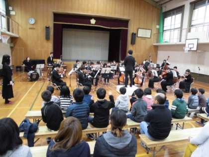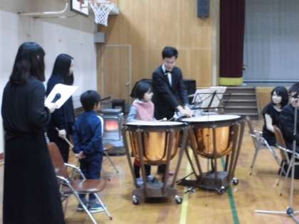 神山交響楽団の演奏の他、打楽器体験や指揮者体験もさせていただきました。今年は、ティンパニーを演奏させていただきました。児童は大興奮でした。