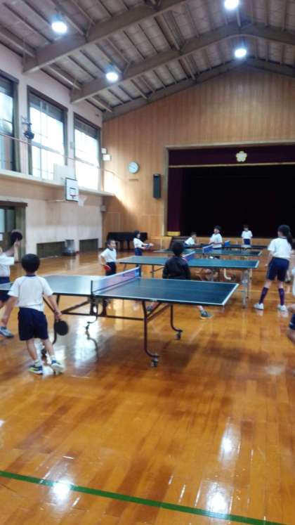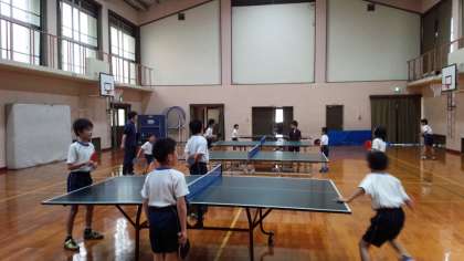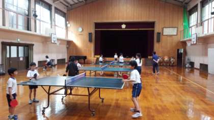 静原校では部活動も熱心に行われています。火曜日は卓球です。2年生から6年生までの子どもたちが、時にはアドバイスし合ったり、時には対戦したりして、楽しく活動しています。