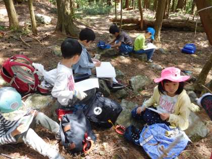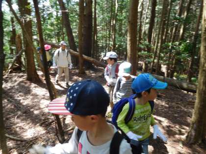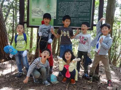 校区探検で静原城跡に行ってきました。急な斜面やたくさんの倒木がありましたが、目印になる赤いテープやロープがたくさんあり,迷うことなく登ることができました。