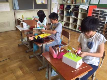 図工の時間に「くるくるクランク」の作品を作っています。針金を回すと,針金につけたストローが上下左右に動きます。その動きを上手に生かすような作品を考えています。