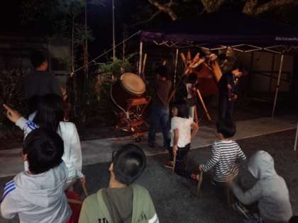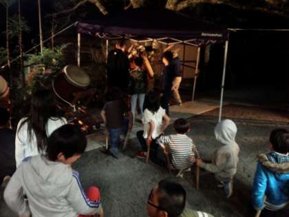 5月3日の春祭りの前夜、宵宮が行われました。子どもたちは春祭りを告げる太鼓をせいいっぱいたたきました。子どもたちのたたく太鼓が村中に轟き、春祭りを盛り上げています。