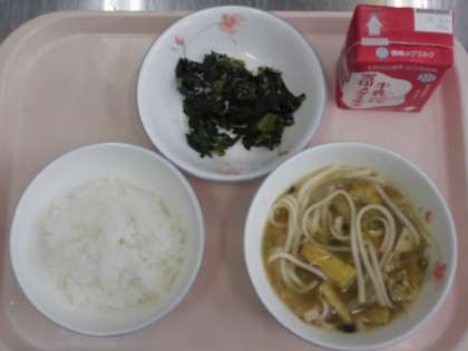 減量ごはん 牛乳 カレーうどん ほうれん草とじゃこのいためもの