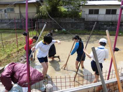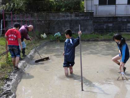 決して田んぼで遊んでいるわけではありません。田植えをするために,田を平らにしているのです。