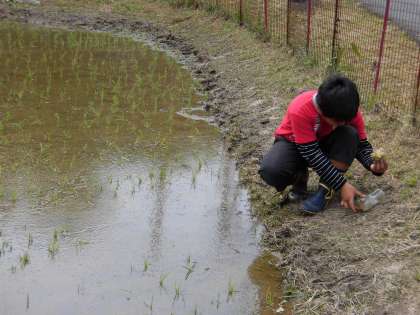 田植えの後になりましたが,ペットボトルで育てた苗も田んぼのはしの方に植えました。自分で育ててきた苗だけに,大きく育ってほしいという思いがひときわ強いようです。これからも,しっかりとイネを育てていくことを,誓っていました。