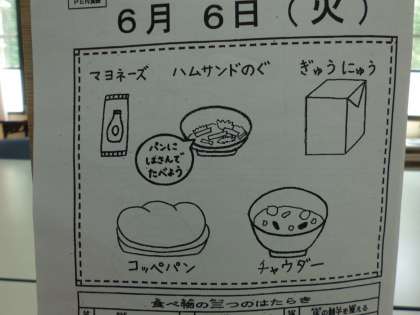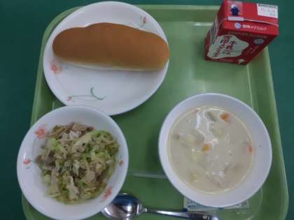 今日の給食はコッペパン・牛乳・チャウダー・ハムサンドの具です。パンに具をはさんで,ハムサンドにしていただきます。