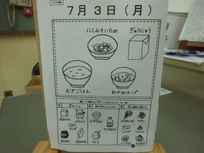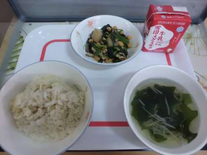今日の給食は麦ごは・牛乳・わかめスープ・肉みそ炒めです。
