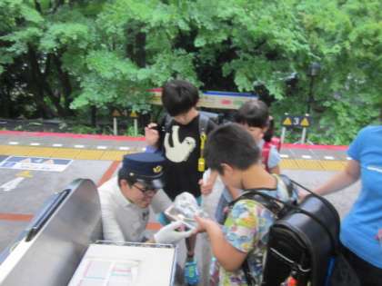 駅員さんに,クワガタを見せているようです。