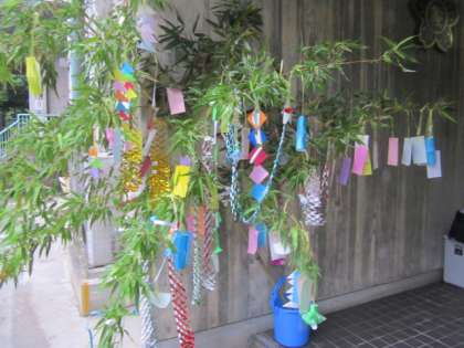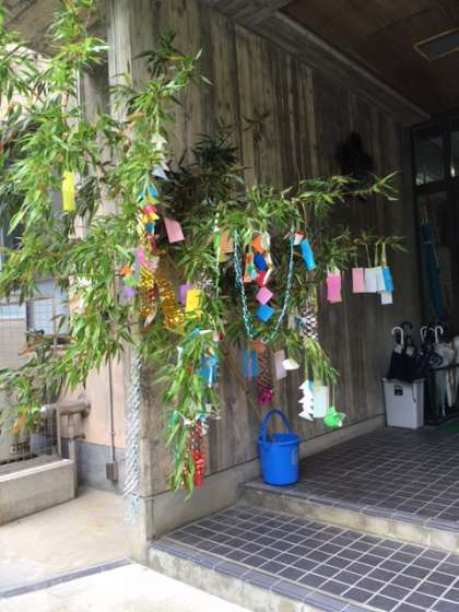 本校児童のお祖父様に持ってきていただきました笹に,七夕飾りが増えてきました。