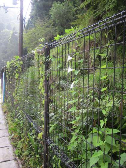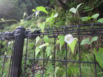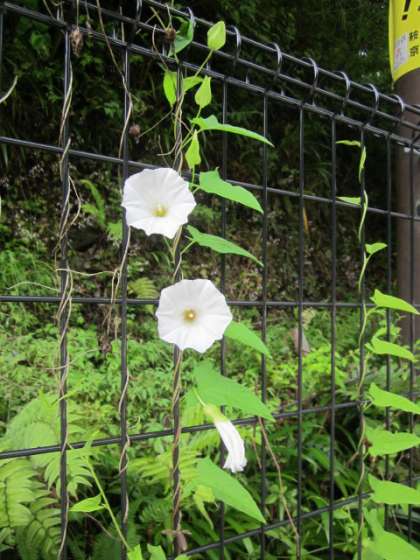 フェンスに白いアサガオが…。毎朝咲いています。