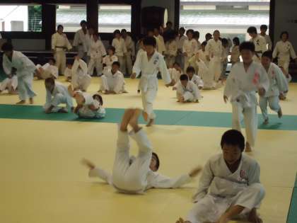 いよいよ合同練習会です。旧武徳殿に一番乗りし,着替えた後,早速畳を出すのを手伝いました。開会式を終えると準備運動開始です。