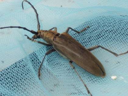 管理用務員さんがカミキリムシを見つけられました。茶色く,鋭いあごと長い触角。