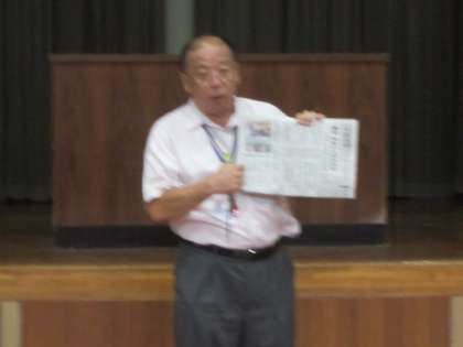 「高温注意報や雷注意報,食中毒注意報も出ています。今日から給食ですが,手を石鹸で洗って,消毒してからいただきましょうね。」
