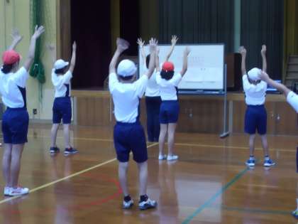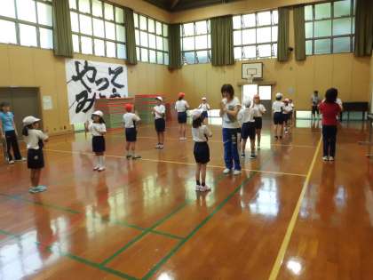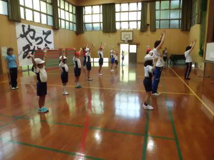 3時間目は運動会の練習です。先生の動きをよく見て覚えていきます。