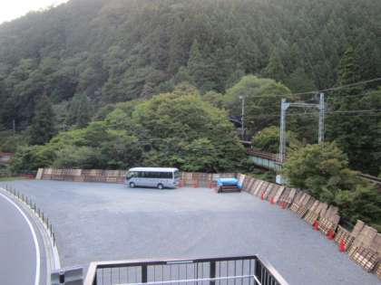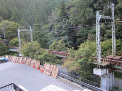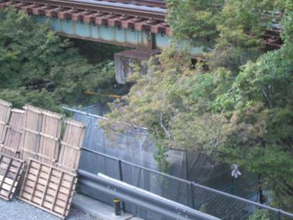 貴船の川床の『床机』を見ていると,叡電橋脚塗装の準備がされていました。