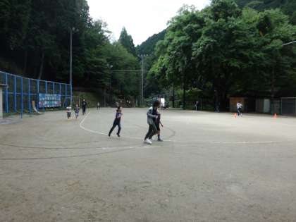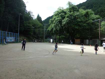 運動場を自分のペースで走ります。