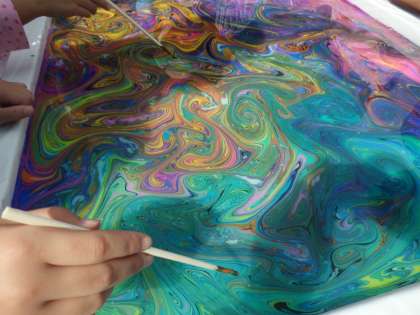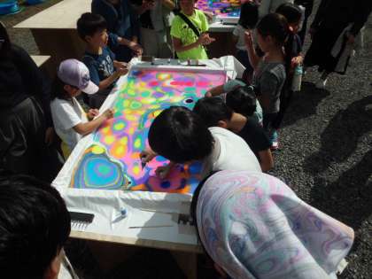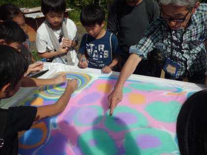 最後に,マーブリングで布全体を染めていきます。二度と同じ模様ができないおもしろさ,そしてインクを垂らした時や,櫛で模様を作る楽しさ,さらに一瞬で布に模様が写る不思議さにみんな興味津々でした。素敵な作品ができました。