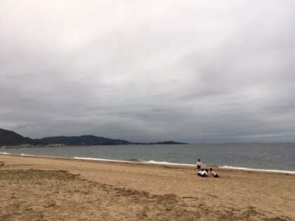 慶野松原は夕日が有名なのですが・・・,残念ながら夕日は見えないようです。走ったり砂遊び、相撲など、波音を聞きながら、楽しんでいます。