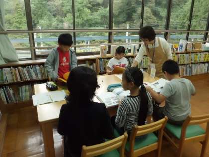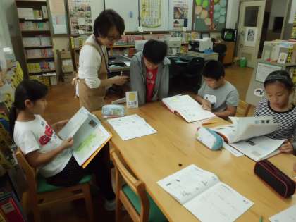 4年生は図書室で百科事典の使い方について学習しています。