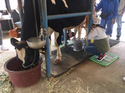 乳搾り体験です。緊張しています・・・。