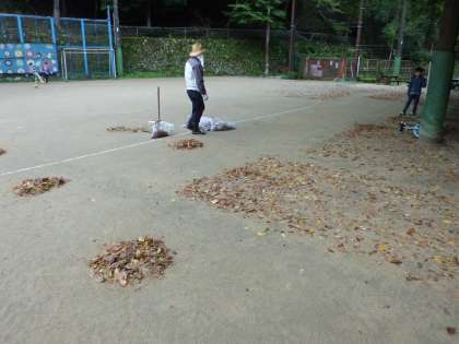 久しぶりに青空が見えています。チカラシバの穂には朝露がついています。管理用務員さんが運動場の落ち葉をきれいに掃いてくださっています。寒い朝ですが,みんな朝から元気いっぱいです。
