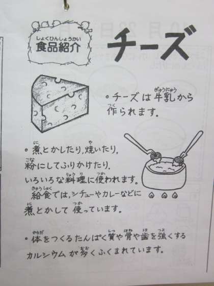 今日の献立にはチーズがありました。昨日の停電中には冷蔵庫が機能していなかったので,今朝,給食協会様が新しいチーズを持ってきてくださいました。ありがとうございました。