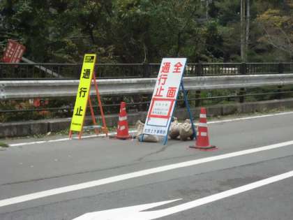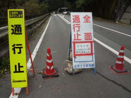 学校のすぐ前に通行止めの看板が立っています。鞍馬温泉より奥の方で土砂崩れがあったようで,通行止めになっています。そこまでは通行可能です。