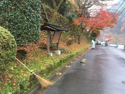 小雨が降っていますが,門掃きが始まりました。
