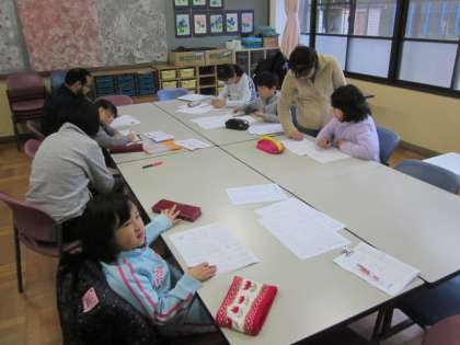 低学年とルイス先生は,『山』等の漢字を練習していました。