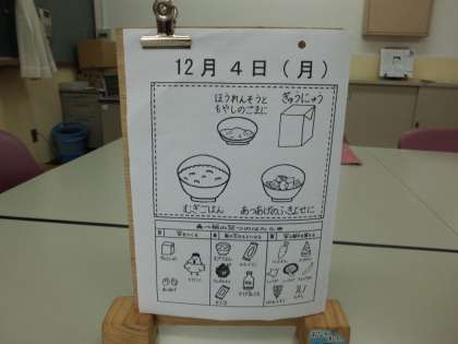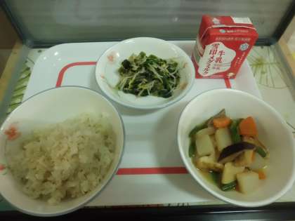 今日の給食は麦ごはん・牛乳・あつあげのふきよせに・ほうれん草ともやしのごま煮です。ふきよせには,野菜などの彩りがきれいですね。今日も感謝の気持ちを込めて「いただきます!」