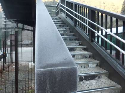 氷点下の朝を迎えています。周りの草には霜がつき,白くなっています。歩道橋も凍てついています。