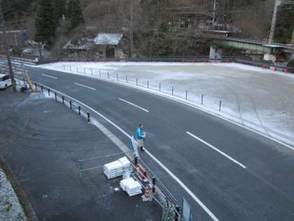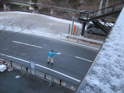 用務員さんが,凍結防止剤をまいています。