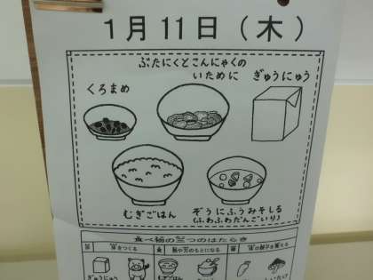 今日の給食は,麦ごはん・牛乳・雑煮風みそ汁・豚肉とこんにゃくの炒め煮・黒豆です。