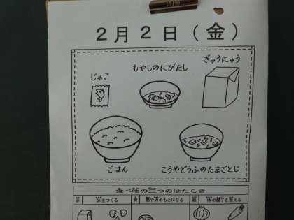 今日の給食は,ごはん・牛乳・高野豆腐の卵とじ・もやしの煮びたし・じゃこです。