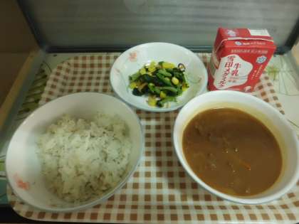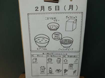 今日の給食は,麦ごはん・牛乳・ハッシュドビーフ・小松菜のソテーです。温かくコクのあるハッシュドビーフが体を温めてくれます。今日も感謝して「いただきます!!」