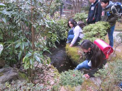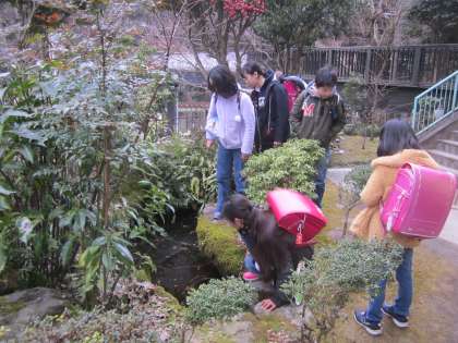 登校後,池の氷に興味津々でした。