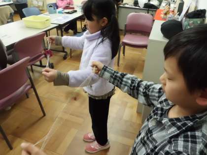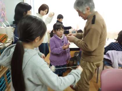 今日の放課後まなび教室は,木の板を使ったぶんぶんごま作りでした。板の角を丸くして色をつけて穴をあけて紐を通してできあがり。みんなの作ったぶんぶんごまはどれもブーンブーンと音がして,とても軽快に回っていました。