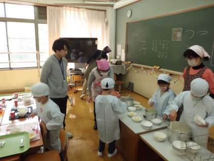 今日の給食は,麦ごはん・牛乳・五目豆腐・ジャガイモのピリ辛炒め・じゃこです。今日も当番の仕事,しっかり頑張っています。