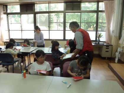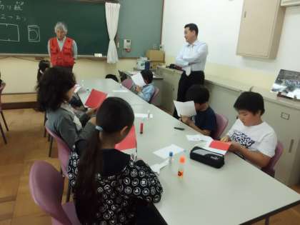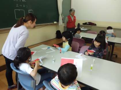 今年度最初の手作り教室がありました。今日は切り紙遊びです。はさみと紙をうまく動かして,線の通りに切って紙を広げると物の形になりました。